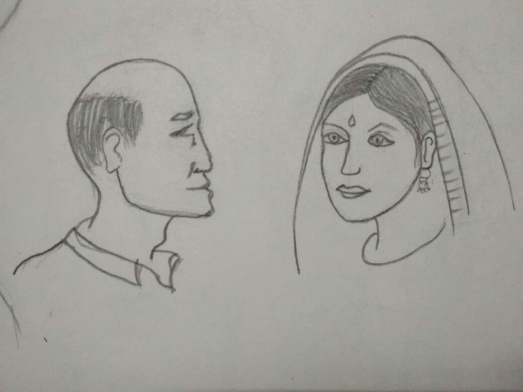 Simple Drawing Of Faces Of Bride And A Old Man - Cute wedding couple holding hands.