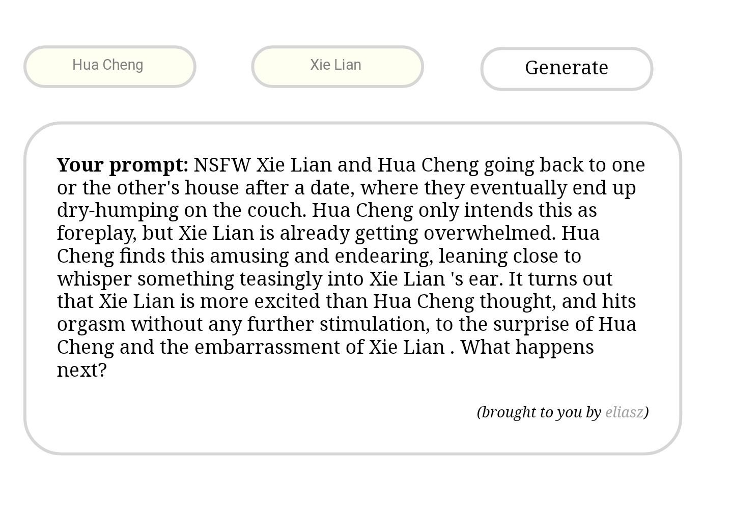 Trending Nsfw Dialogue Prompts Generator / Using this writing prompts generator is very simple, you can generate it randomly, or you can type the words you want to include. Be cautious while using, feel free to interpret prompts however you want or to skip prompts that don't interest you, and enjoy. Nsfw Dialogue Prompts Generator - I found a otp fluff generator greenieloveszelink: