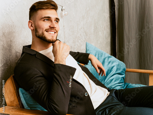 Portrait Of Handsome Smiling Hipster Businessman Model Wearing Casual Black Suit Fashion Stylish Man Posing Sitting In Chair In Luxury Interior Thinking Buy This Stock Photo And Explore Similar Images At - Portrait of a fashionable young man with stylish haircut wearing trendy suit posing.